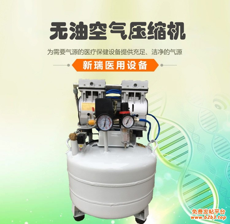无油空气压缩机采用无油活塞式设计,保证压缩气体中无油分子,配水气分离系统,压力调节范围为0.2Mpa~0.8Mpa,气罐一次性储气量≧30L,主机气量≧115L/min,噪音≦52db。其适合在医 疗环境卫生条件下使用,主要是为需要气源的医 疗保健设备提供充足、洁净的气源,适用于牙科设备制氧机设备、呼吸机设备、医 用设备等。